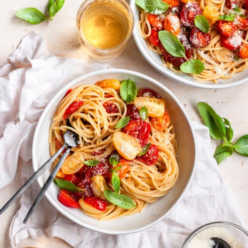 If you love classic bruschetta, this pasta version is going to be on repeat all summer. It has everything you want-juicy tomatoes, garlic, fresh basil, and parmesan-tossed with warm pasta for a simple but elevated dinner. I have a whole collection of pasta recipes if you're looking for more easy weeknight ideas like this one.