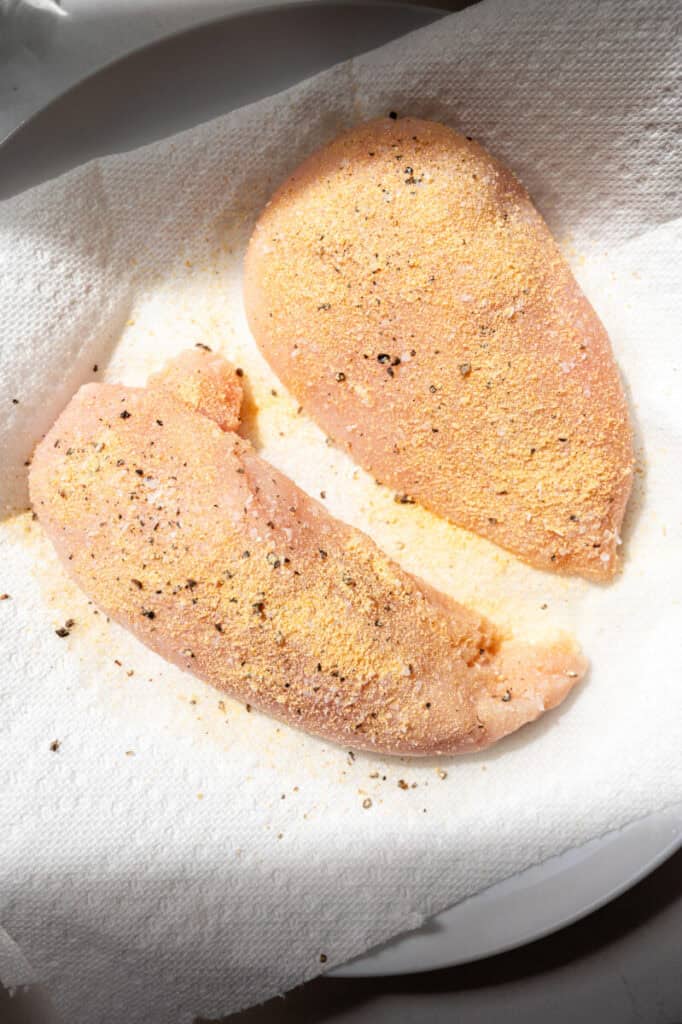 - Pat chicken breasts dry. Season both sides with salt, black pepper, onion powder, and garlic powder.
