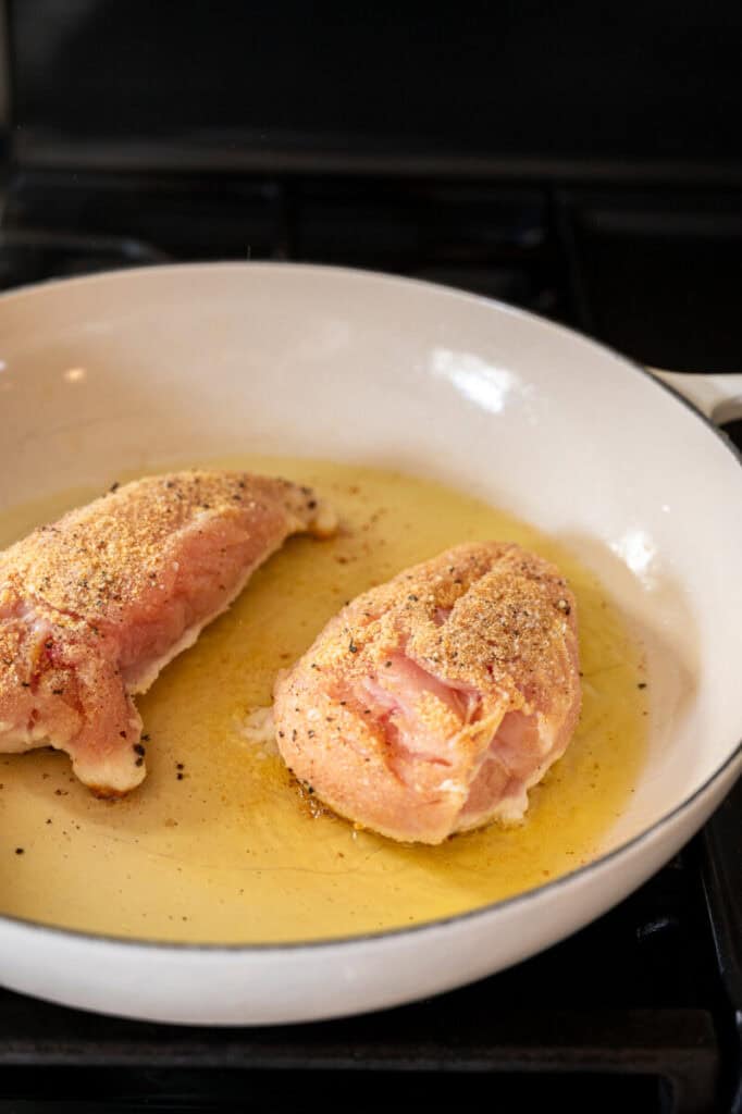 - Heat a large skillet over medium heat. Add olive oil and chicken breasts. Cook for 5-6 minutes per side, untouched, until the internal temperature of the chicken reaches 165F. Transfer to a plate and set aside.