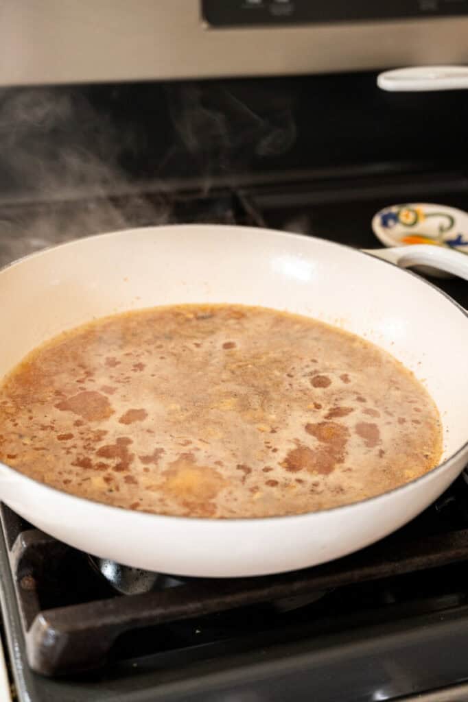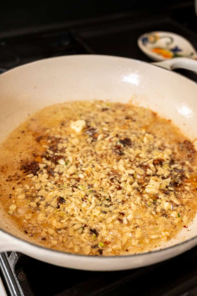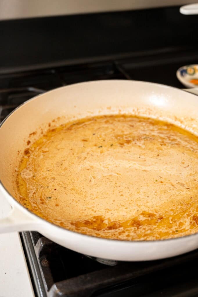 - While the pasta is cooking, heat butter in the same skillet used to cook the chicken. Add minced garlic and cook for 1 minute, until fragrant. Add white wine and chicken broth and bring to a simmer. Season with salt and pepper.