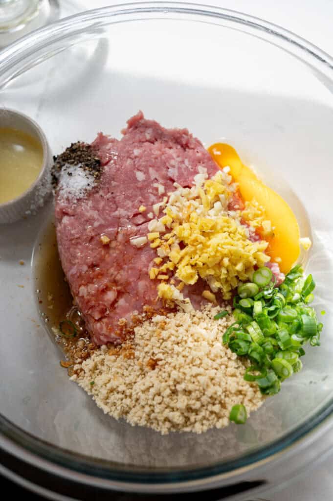 - Make the meatball mixture. In a large bowl, combine ground pork, egg, panko breadcrumbs, garlic, ginger, soy sauce, sesame oil, sriracha, black pepper, and green onions. Mix until just combined.