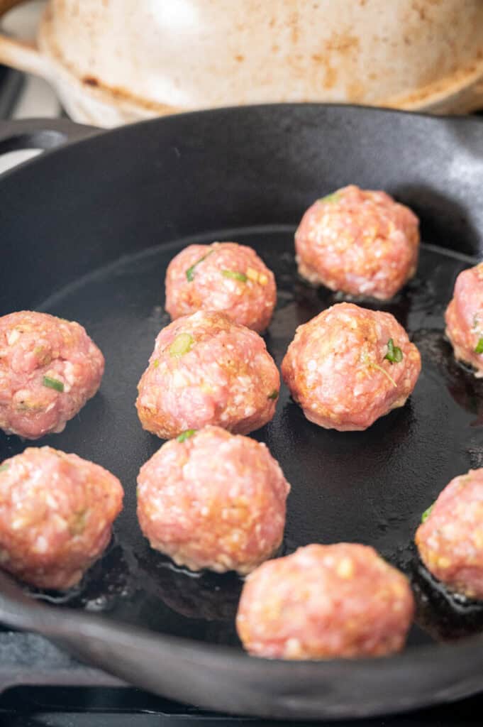 - Sear the meatballs. Heat avocado oil in a large oven-safe skillet over medium-high heat. Add the meatballs and sear for about 2 minutes per side, until browned. They do not need to be cooked through.