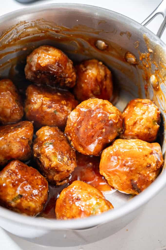 - Coat the meatballs. Toss the cooked meatballs in the glaze or drizzle it over the top.