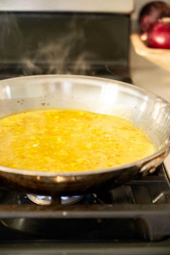 - Meanwhile, add butter to a pan over medium heat. Stir until melted, then add the saffron water mixture and garlic to the skillet. Sauté for 3 minutes, until fragrant.