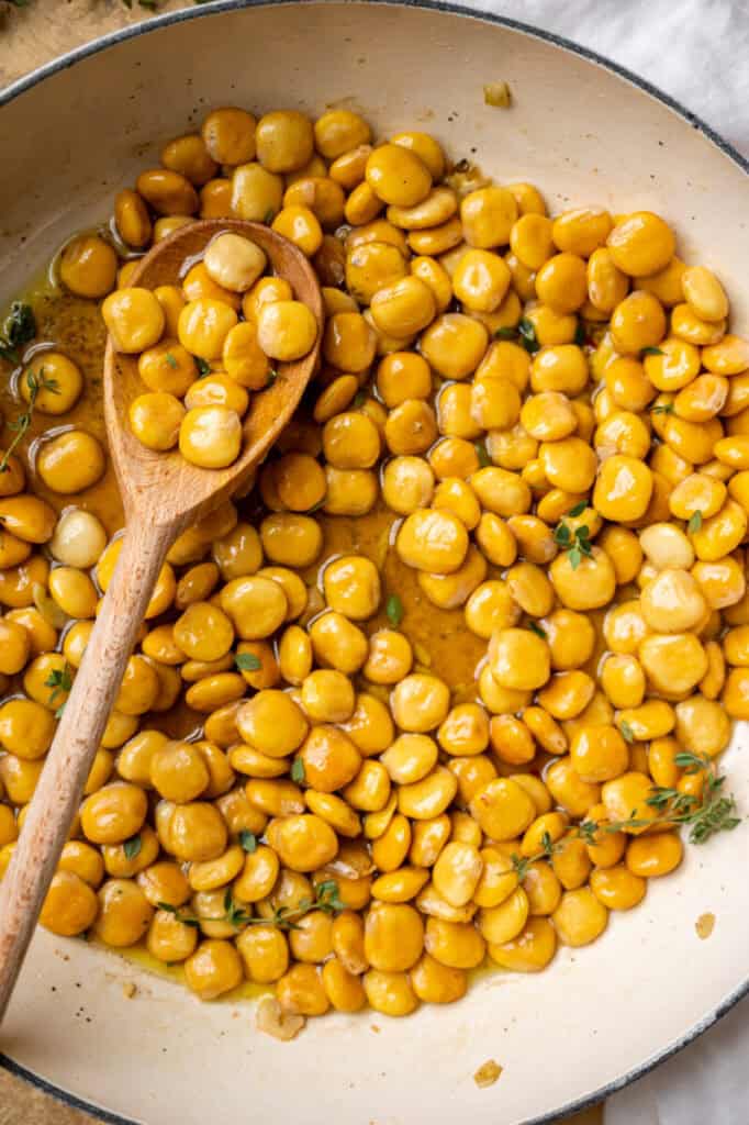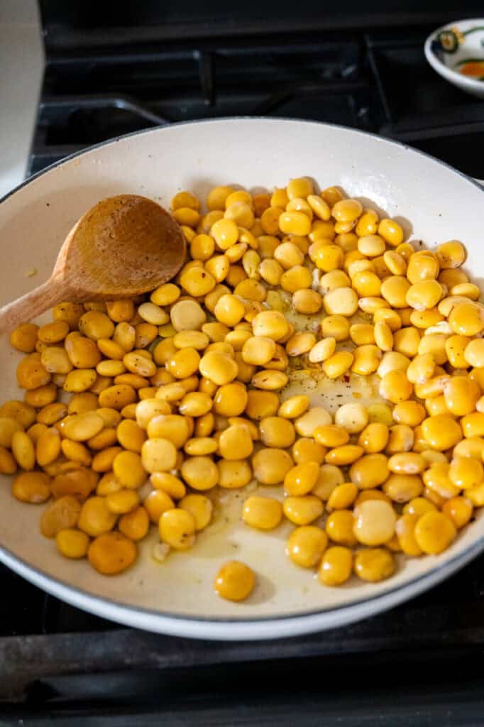 Lupini beans are often served as a simple snack, but they can also be cooked and flavored for a more elevated dish. In this recipe, I sauté them with garlic, olive oil, and a splash of chicken stock for a warm, savory preparation that's full of flavor.