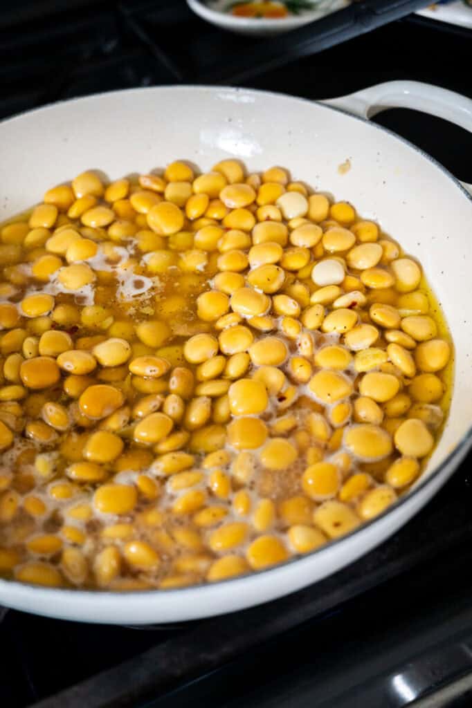 - Add lupini beans, salt, pepper, and red pepper flakes. Simmer on low heat for 5 minutes.